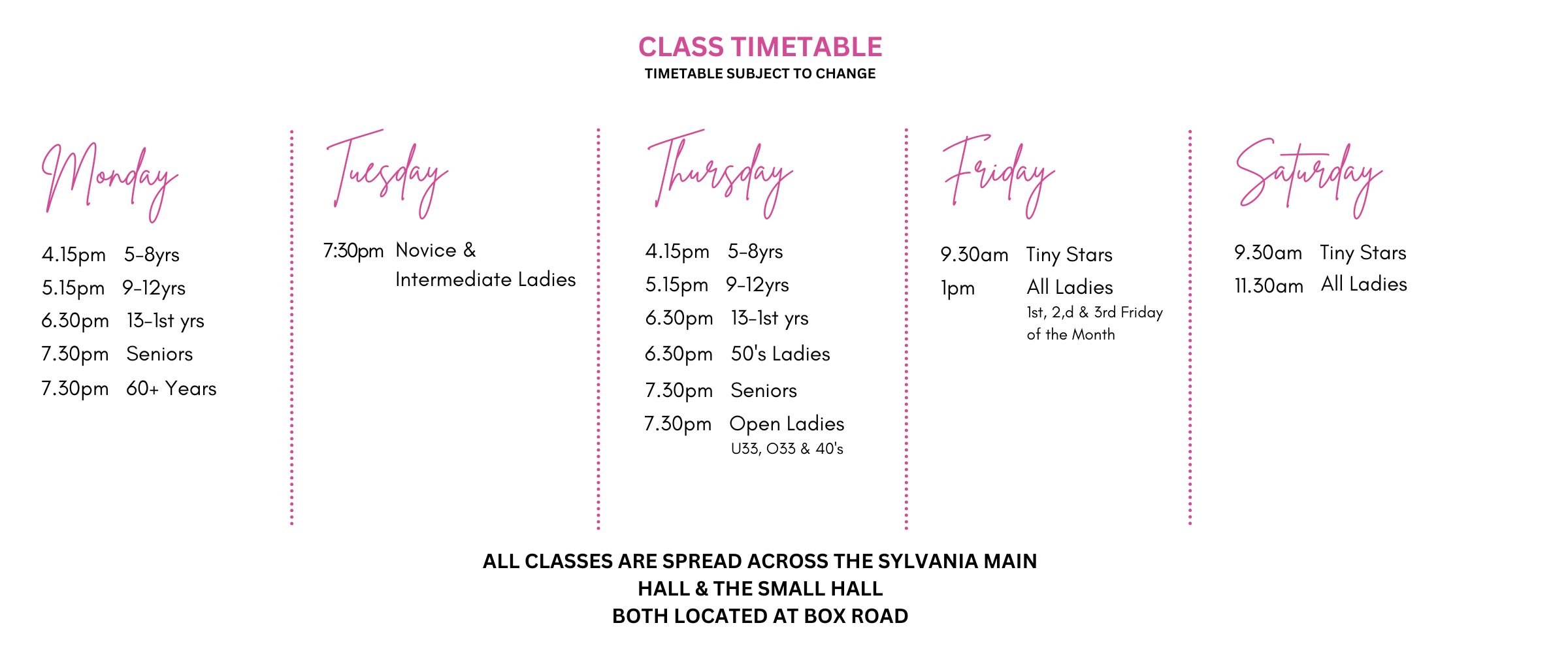 Ladies classes are on Tuesday nights, Thursdays nights and Saturdays.